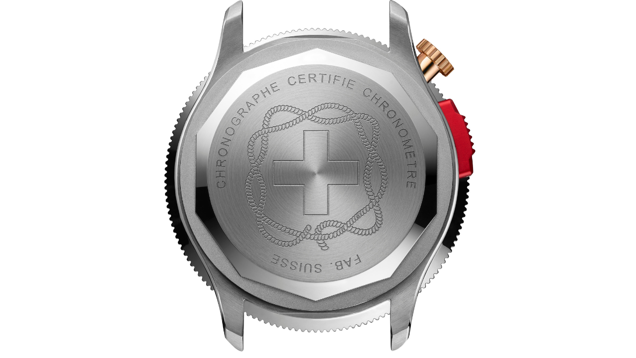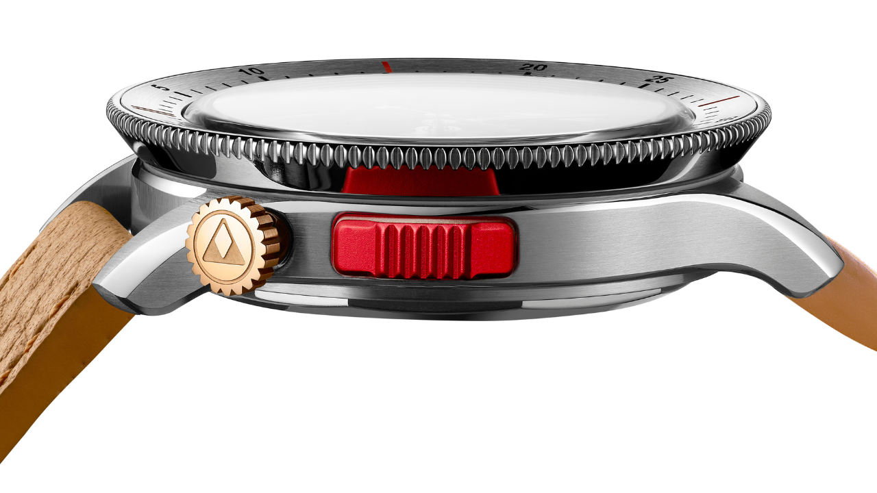 O monopusher às 9h30 em alumínio anodizado vermelho controla o cronógrafo, resgatando as construções de cronógrafos dos anos 1950. A bezel giratória bidirecional tem escala de 60 unidades e perfil cônico para melhorar o grip.