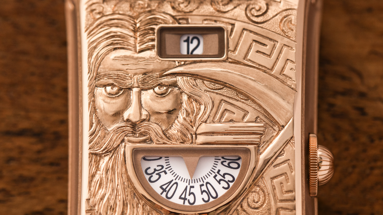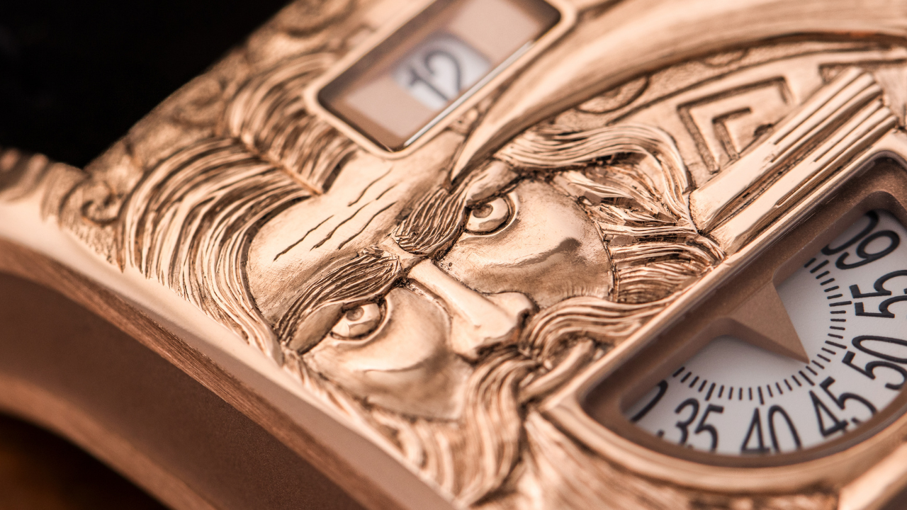 O Neo Digiteur Chronos parte do conceito do Digiteur original, um relógio mecânico com exibição digital e sem ponteiros, mas leva essa proposta a um nível muito mais radical. A caixa em ouro 5N maciço é completamente gravada à mão e substitui o mostrador por uma superfície esculpida, onde a figura de Chronos organiza toda a leitura do tempo.