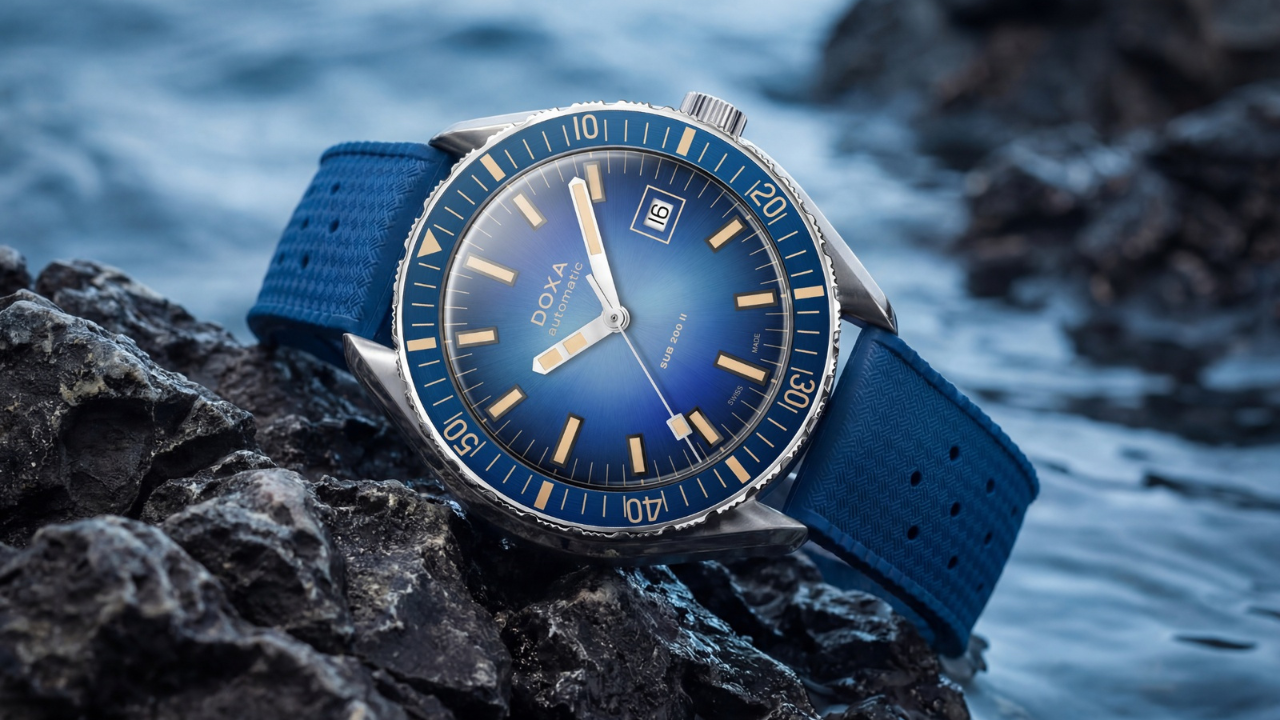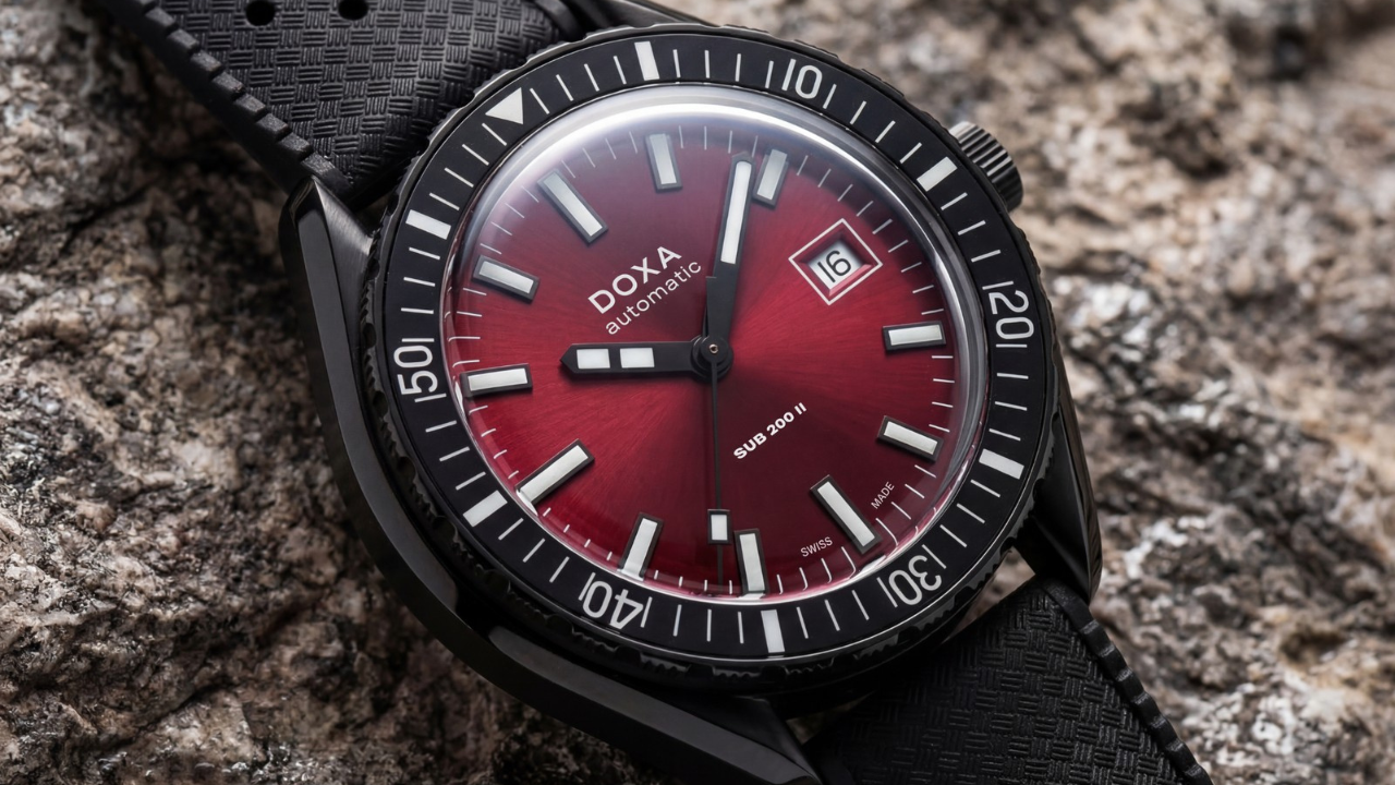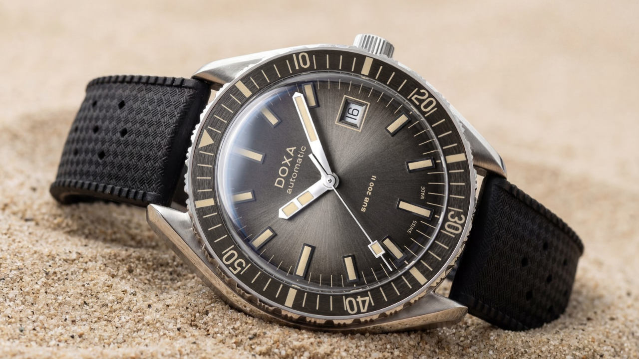 A Doxa foi direta sobre a lógica por trás da escolha: o SUB 200 II é o modelo mais relaxado da linha, pensado para uso cotidiano em terra tanto quanto na água. O fumé com acabamento sunray abre mão de um pouco da legibilidade técnica de mergulho em favor de um visual mais elegante no dia a dia. É uma decisão que faz sentido para o posicionamento do modelo.