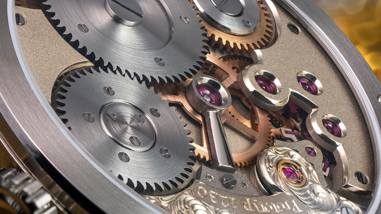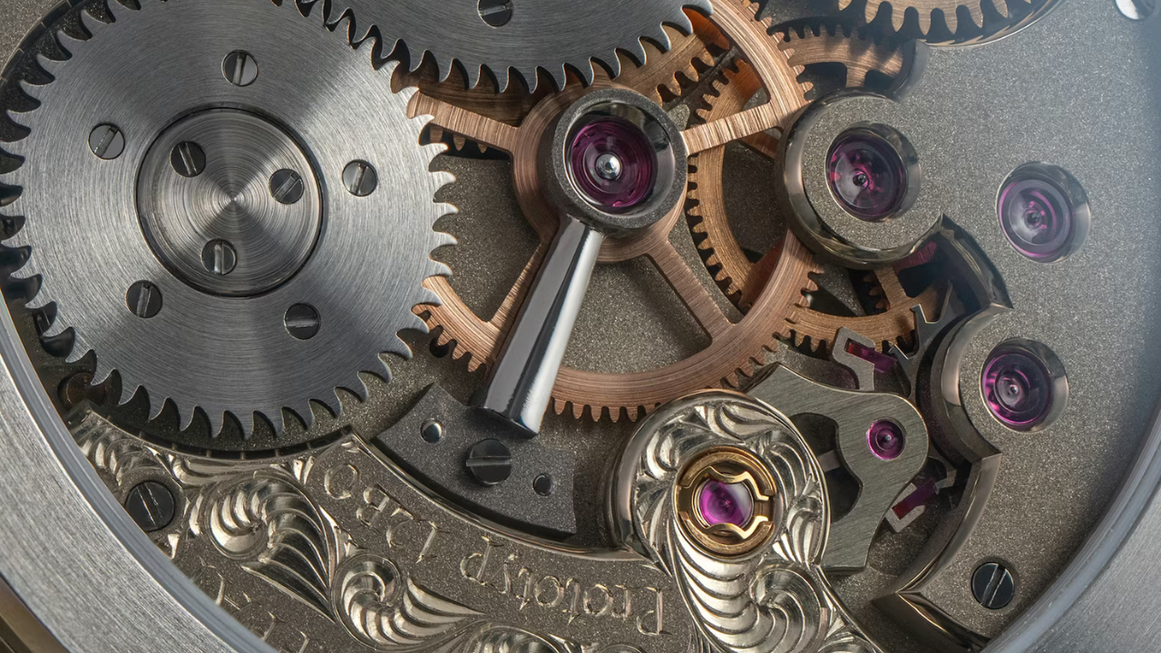 O calibre opera a 18.000 alternâncias por hora e entrega cerca de 46 horas de reserva de marcha. As rodas de remontagem têm dentes de lobo, uma solução clássica para transferência de energia mais suave e menor desgaste ao longo do tempo. O mecanismo de click, normalmente exposto, fica aqui encapsulado numa estrutura fechada que retém os microdetritos metálicos gerados durante a remontagem, evitando que se espalhem pelo movimento.