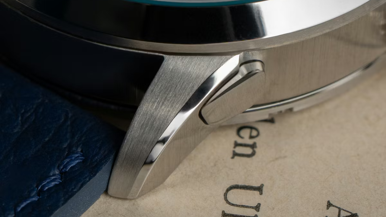 A caixa foi redimensionada: 39mm de diâmetro, 10,5mm de espessura e 47,5mm lug-to-lug. Quatro pushers estão integrados nas hastes. Apenas um está ativo nesta versão, usado para correção rápida da data sem interromper o funcionamento do relógio. Os outros três estão reservados para complicações futuras.