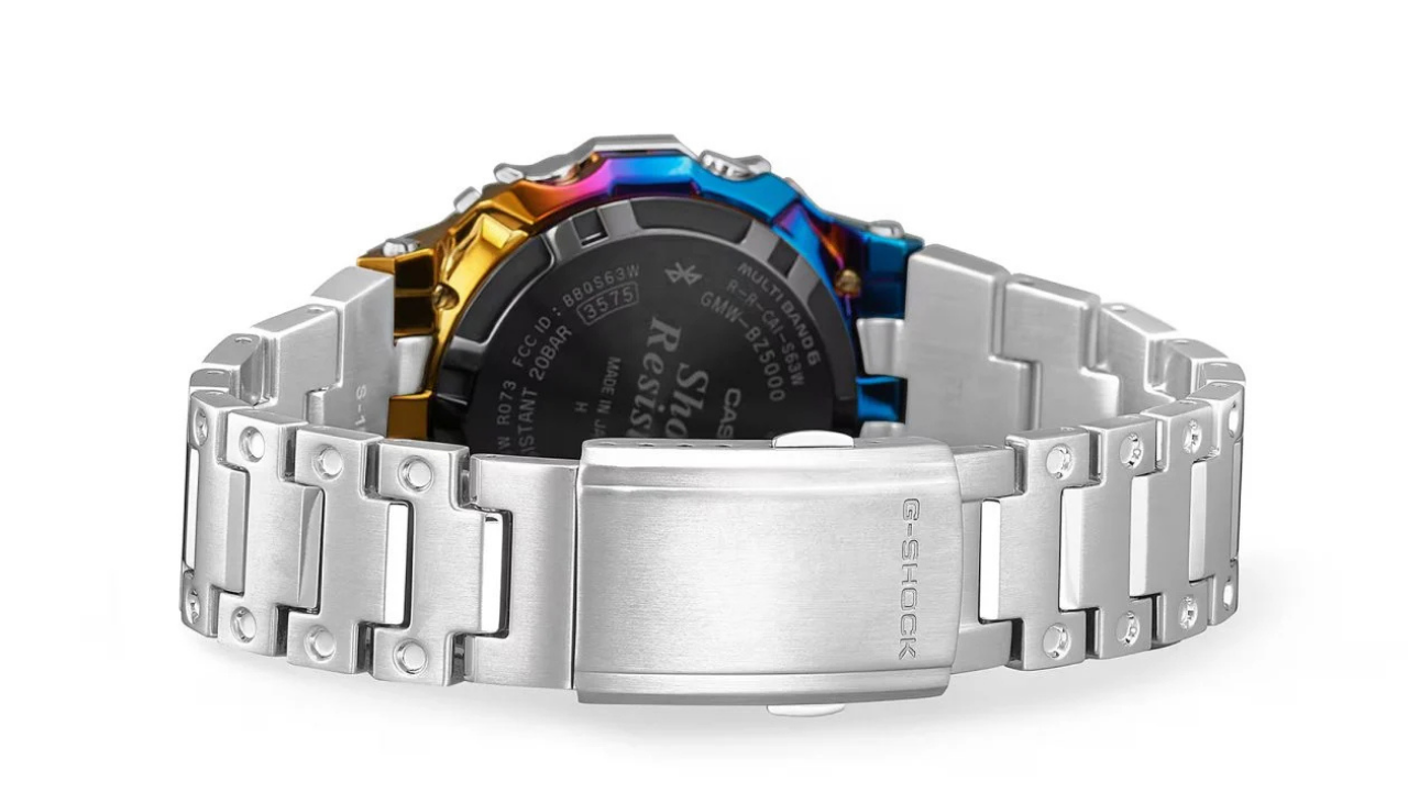 A linha Full Metal do G-Shock existe para quem quer a resistência do original com acabamento em aço do topo ao bracelete. O GMW-BZ5000RC é a versão mais visualmente ousada até agora: uma camada de revestimento multicolorido aplicada por processo de ionização que percorre a carrure com um gradiente que vai do dourado ao azul-violeta e ao vermelho.