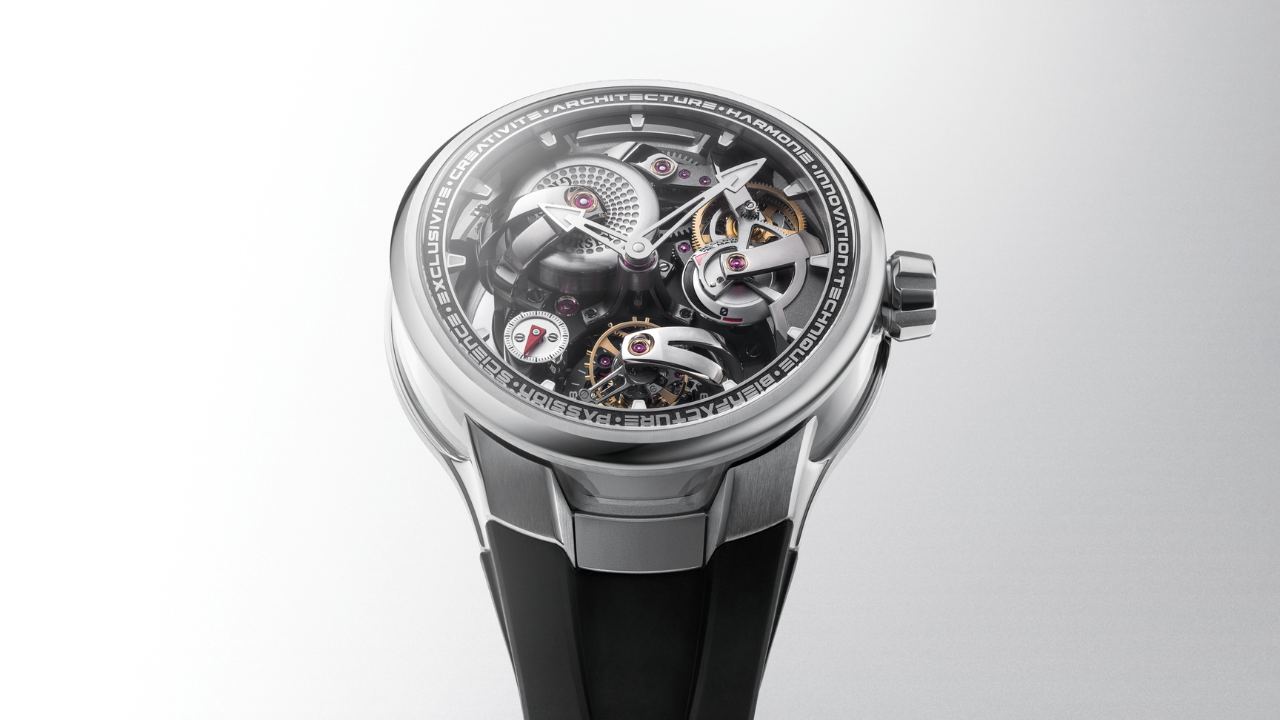 A proposta do Architecture sempre foi radical: em vez de um movimento dentro de uma caixa, uma composição mecânica suspensa no espaço. Não há mostrador separado. A estrutura do calibre é o próprio mostrador.