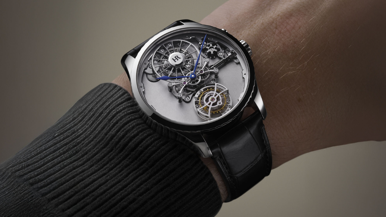 No Honoris original, o mecanismo fica escondido por baixo do dial. No Meccanica, tudo fica exposto. A arquitetura tridimensional do calibre se torna o próprio mostrador, organizada em torno do monograma HR no centro.