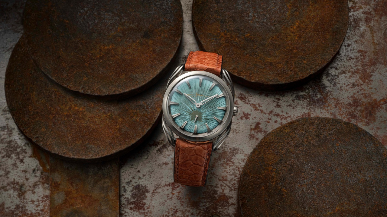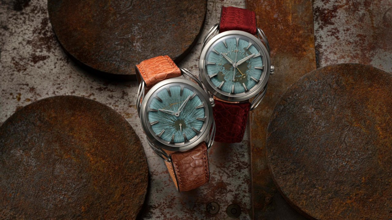 Os dois mostradores são feitos à mão com pátina de óxido de cobre, dando um aspecto oxidado e escurecido ao conjunto. Linhas profundas irradiam a partir do centro de cada mostrador, criando um relevo que muda com a luz. Os rotores também recebem pátina e entalhe manual, criando um visual de artefato arqueológico visível pelo fundo de safira.