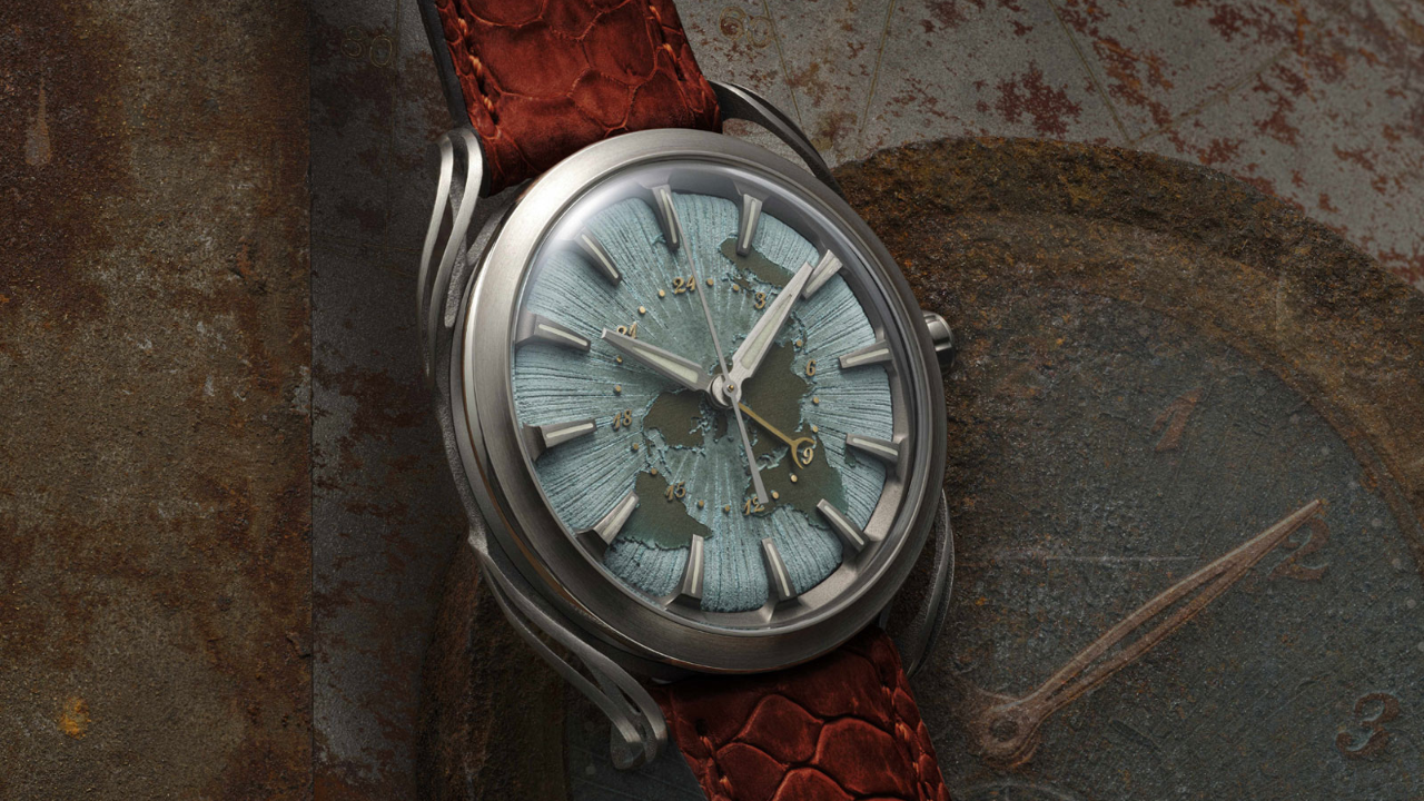 Mostrador: pátina de óxido de cobre, feito à mão, mapa-múndi, escala GMT 24h com numerais Breguet