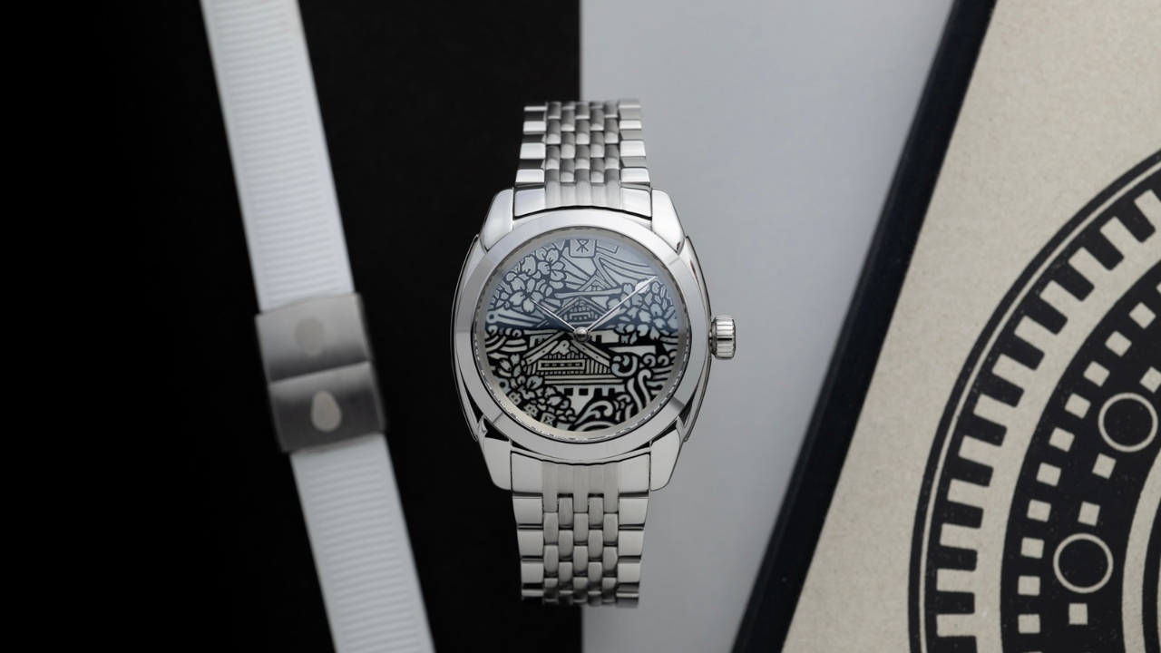 Quando a Isotope e Altmann decidiram colaborar, a escolha do motivo para o mostrador foi natural. A tampa escolhida é a de Osaka, no Japão, com o Castelo de Osaka cercado por flores de cerejeira. É um design com linhas finas e precisas, o tipo de composição que pede uma técnica específica para ser reproduzida num mostrador. A escolha foi o esmalte cloisonné.