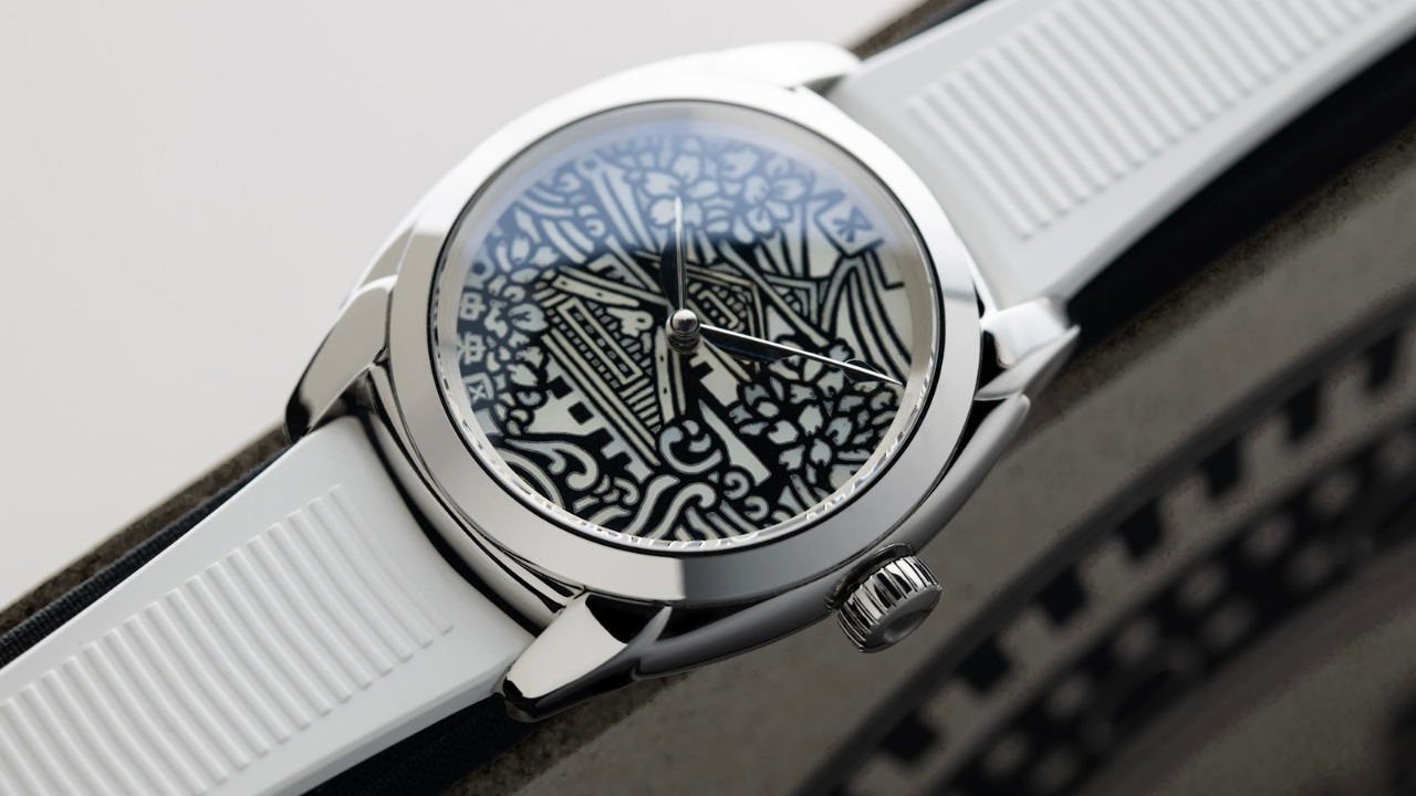 Cloisonné é uma variação do esmalte grand feu que usa fios metálicos extremamente finos aplicados sobre o mostrador para criar barreiras físicas entre as cores. Sem esses fios, as diferentes camadas de esmalte se misturam durante a queima. Aqui, fio de prata delimita as seções pretas e brancas da ilustração, reproduzindo com precisão o desenho da tampa de bueiro.
