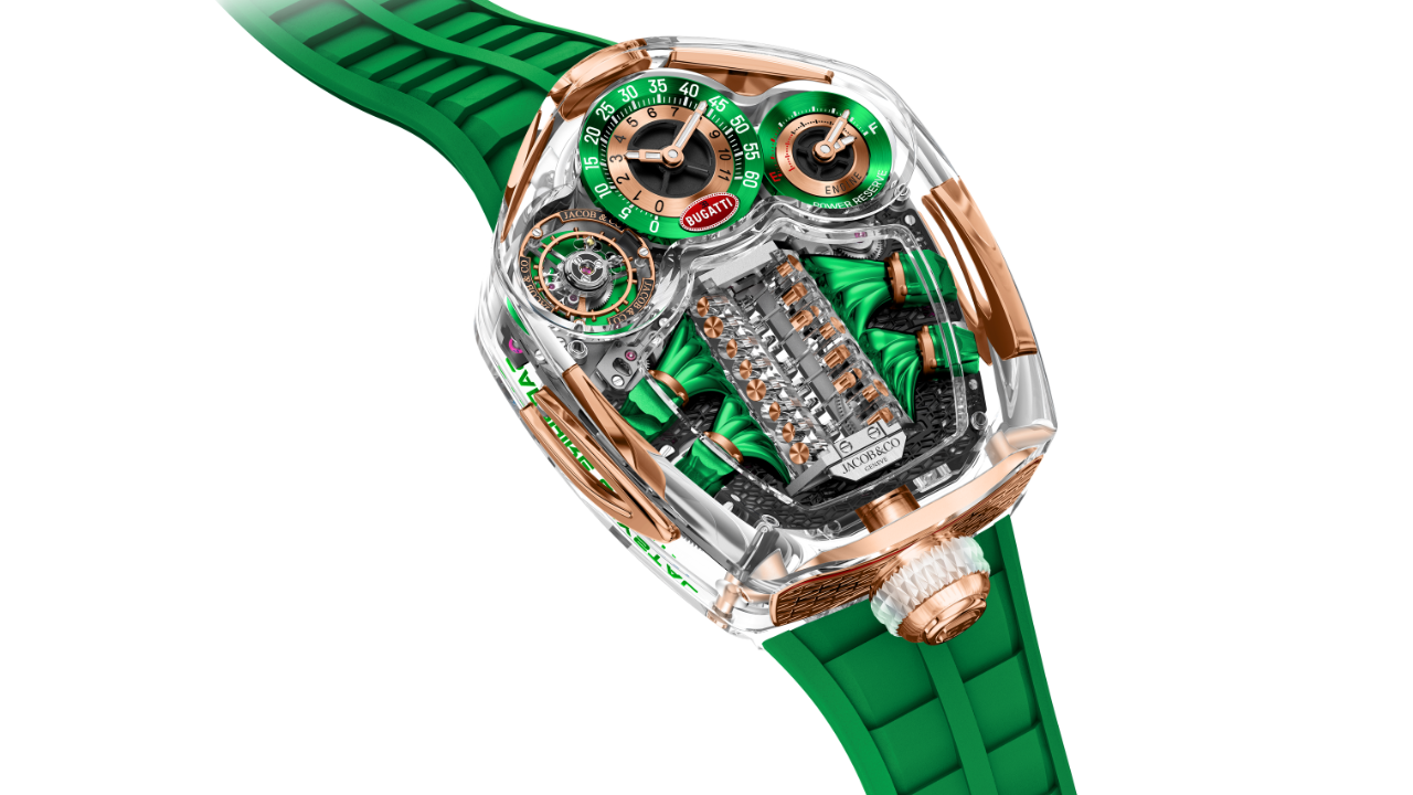 Dois anos após o lançamento do Bugatti Tourbillon e um ano após a versão Baguette, a Jacob & Co. apresenta a iteração mais radical da linha: o Bugatti Tourbillon Sapphire Crystal, com a caixa inteiramente fabricada em cristal de safira sólido e transparente. São dois exemplares únicos, um em verde e outro em azul bebê. USD 1.200.000 cada.