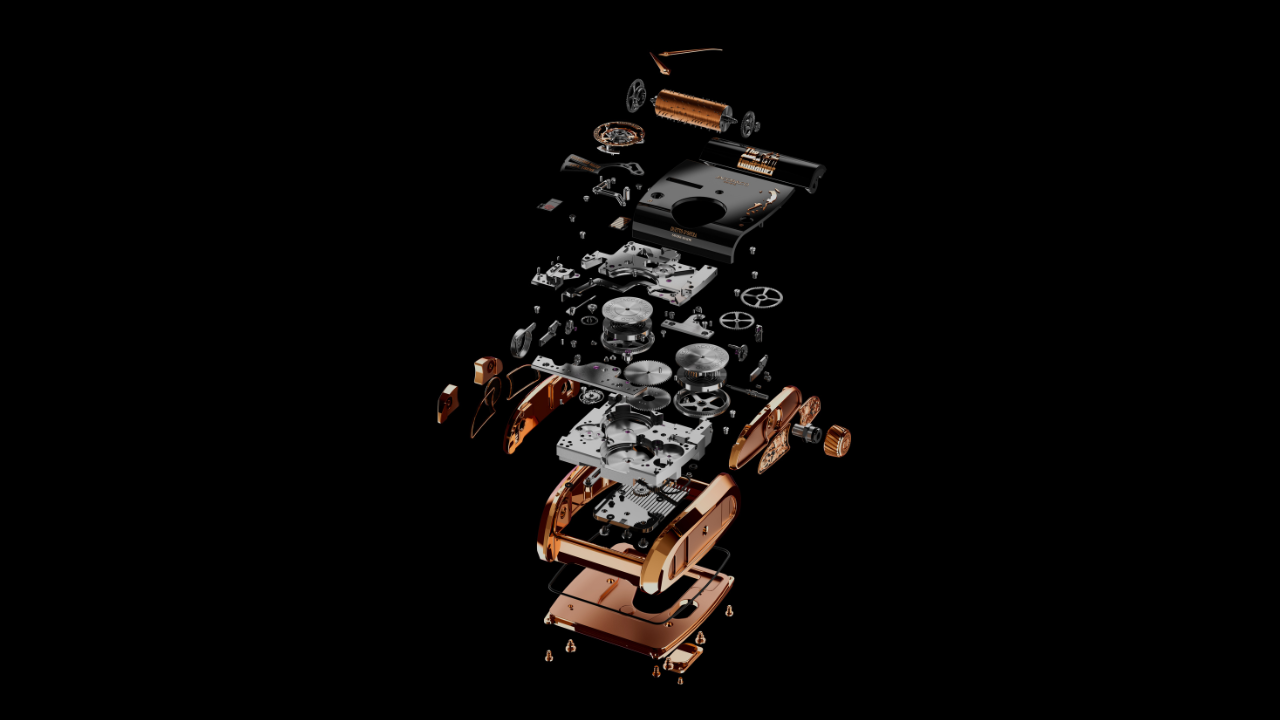 A inovação técnica está no seletor às 10h: um deslocamento lateral de menos de um milímetro muda quais pinos entram em contato com o pente, alternando entre as duas composições programadas num único cilindro. Programar duas melodias no mesmo cilindro é o que permitiu manter a caixa mais compacta do que o modelo anterior e ainda acomodar um tourbillon volante de um minuto.