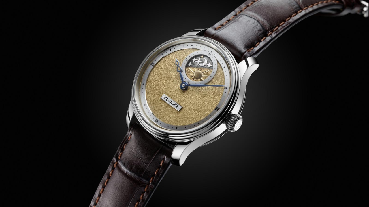 O Kudoke 2 tem a mesma caixa de 39mm mas com 10,7mm de espessura para acomodar o calibre Kaliber 1-24h, que adiciona a indicação dia/noite às 12h. O motivo celestial esculpido que representa esse display funciona como um segundo plano de textura e ganha profundidade visual com o tremblage ao redor. O acabamento complementa a complicação sem disputar atenção com ela.