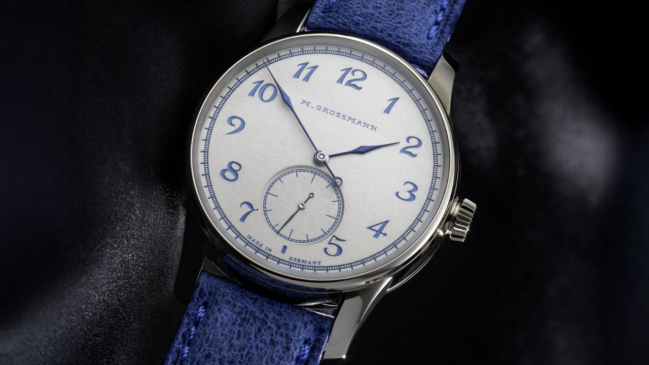 Mostrador: latão silver-plated by friction, textura granulada fina, numerais arábicos e escala em azul, logo M. Grossmann vintage