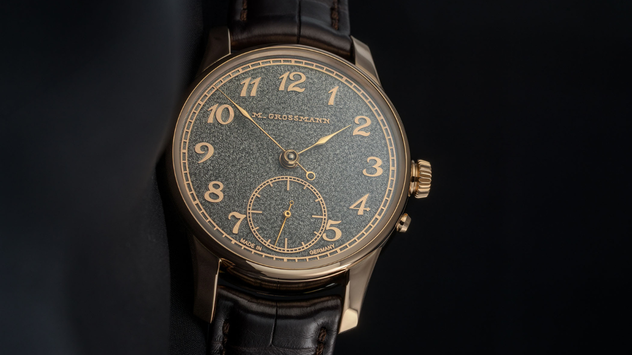 Na versão em caixa de ouro rosa, o mostrador recebe tratamento de ródio negro, criando um contraste forte entre o fundo escuro e os elementos em relevo, com ponteiros em ouro combinado. Na versão em platina, o mostrador preserva o tom natural do ouro, com ponteiros em aço polido. Ambas usam o logotipo histórico "M. Grossmann" tal como era usado em 1875.