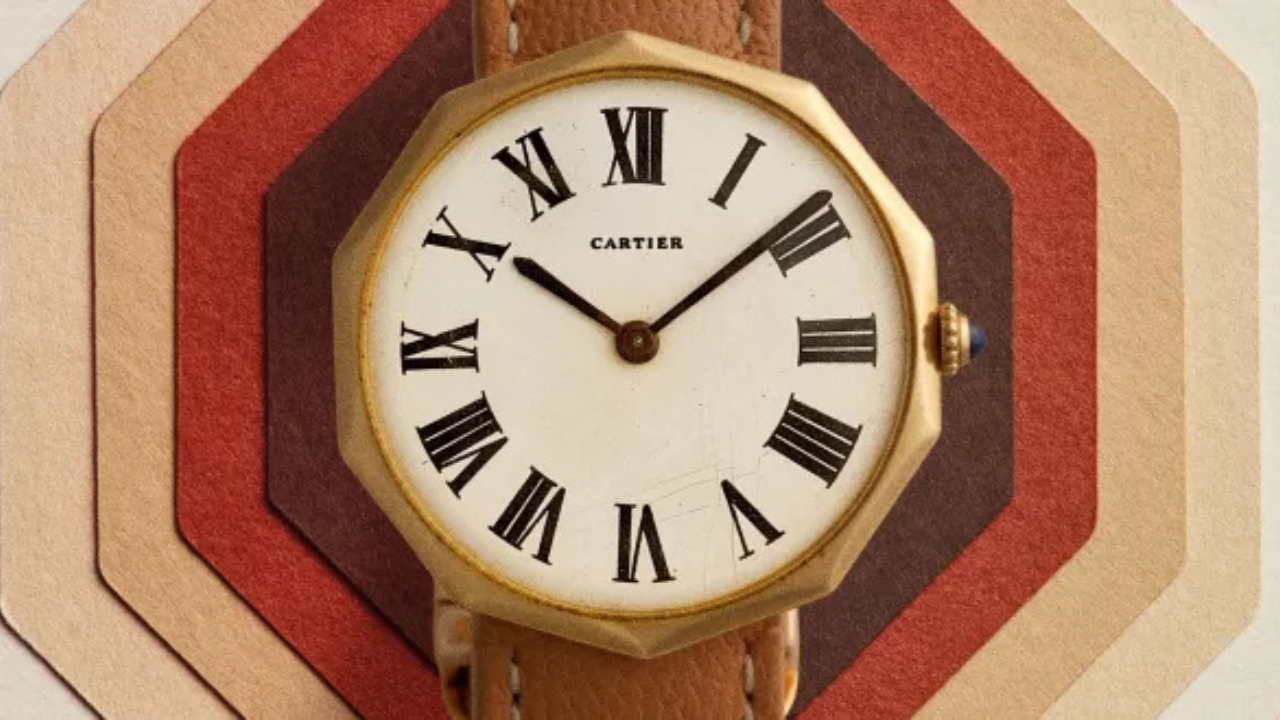 O Cartier Decagonal de Londres, em ouro amarelo de 18k com dez lados e numerais romanos grandes, datado de 1970-71, tem estimativa entre USD 60.000 e USD 80.000. A pesquisa da Sotheby's identificou apenas cinco exemplares conhecidos no mercado, todos em tamanho masculino.