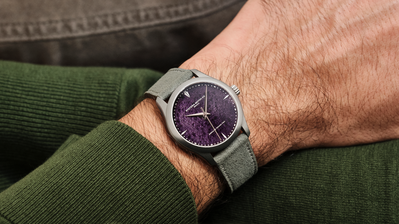 A Statera estava testando técnicas de esmalte sem destino definido, explorando como trabalhar texturas e profundidades no material. Num desses testes, saiu um mostrador roxo com variações de relevo dentro do próprio esmalte que não seguiam nenhuma lógica predeterminada. De um ângulo, lembra uma cordilheira. Com a luz mudando, parece a superfície lunar. Olha de perto e tem textura de veludo. Nenhuma peça vai sair igual à outra.