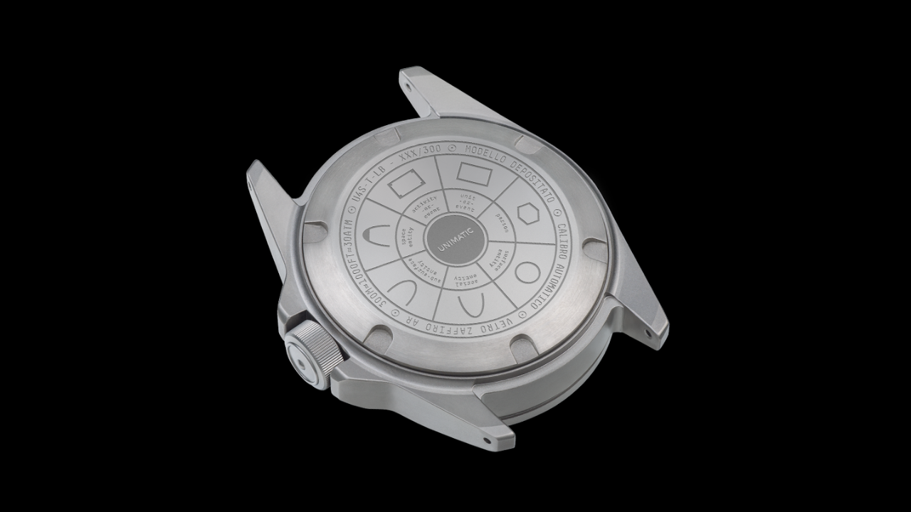 A caixa segue a arquitetura típica da Unimatic, com bezel fixo monobloco e coroa rosqueada de 8 mm. No fundo, a gravação traz símbolos da NATO Joint Military Symbology, representando forças amigas, hostis, neutras e desconhecidas.