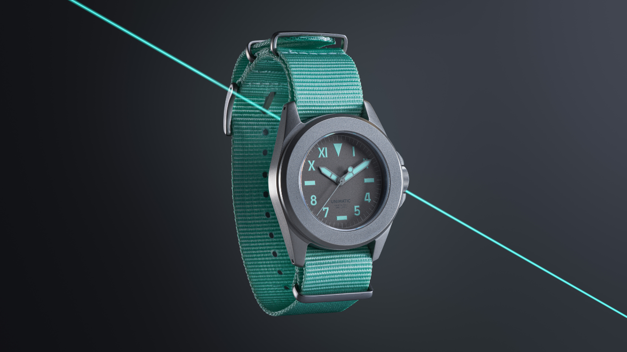 O modelo vem com uma NATO em nylon verde menta, com ferragens em titânio jateado assinadas pela marca.